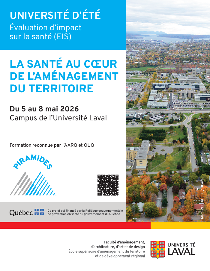 5 mai 2026 au 8 mai 2026Campus de l’université Laval, Pavillon KrugerUniversité d’été 2026 | Évaluation d’impact sur la santé (EIS) – la santé au cœur de l’aménagement (troisième édition du 5 au 8 mai 2026) -